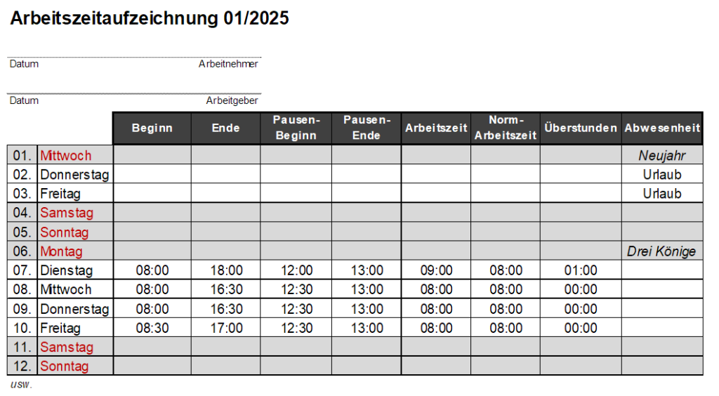 Bei einer schriftlich festgehaltenen fixen Arbeitszeiteinteilung ist bspw. nur die Einhaltung zu bestätigen – lediglich Abweichungen davon sind zu dokumentieren.